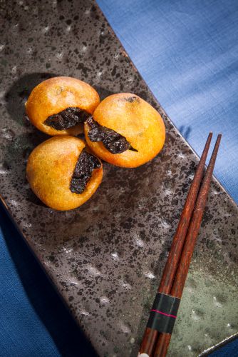 將地瓜球放入油鍋中炸至上色,用鍋鏟壓一壓炸至酥脆,撈起戳一小洞,填入加州葡萄乾即可食用