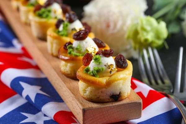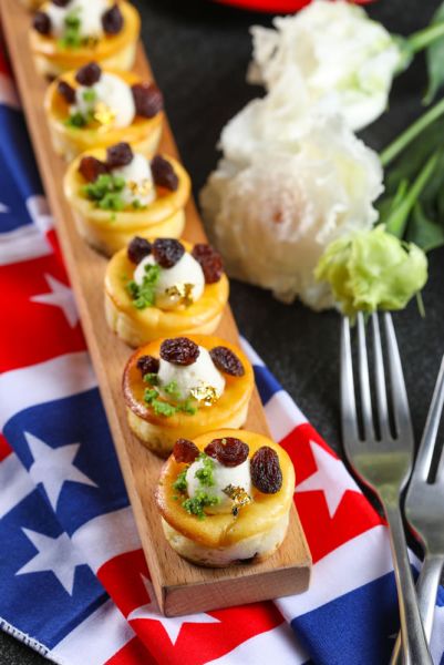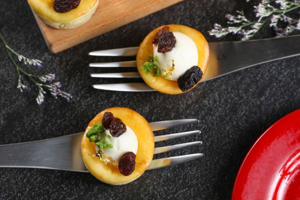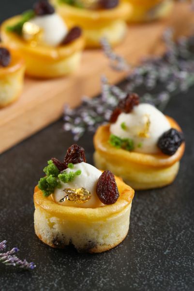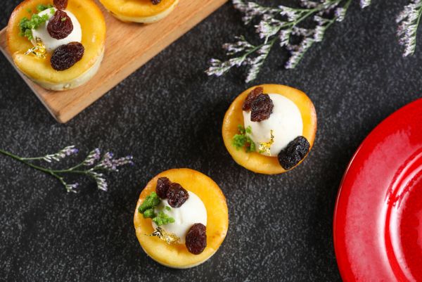 1. 先將奶油乳酪拿出來退冰後,加入糖粉 及香草莢打軟,讓其混合拌勻至無顆 粒狀態,再分2-3次加入優格後加入全 蛋,然後將麵粉過篩後加入動物鮮奶油 拌勻,最後加入加州葡萄乾。