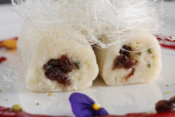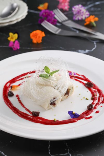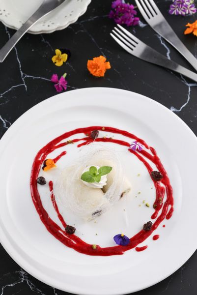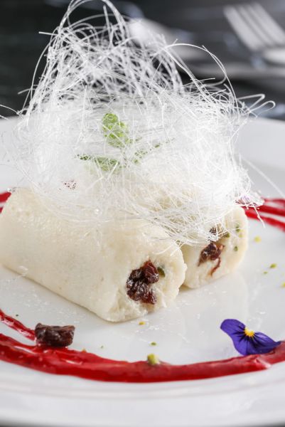 在乾淨桌面抹上少許沙拉油防沾,將煮好 冷卻的乳酪麵皮放上擀至約0.2~0.3cm的 厚度,再將煮好冷卻的卡士達餡擠成長條 狀放入柑橘甜酒加州葡萄乾再捲起,再切 段擺入盤中,擠上鮮奶油後再以薄荷葉裝 飾,上方再以糖絲圍繞,周圍再佐紅酒莓 果醬及柑橘甜酒加州葡萄乾即完成。